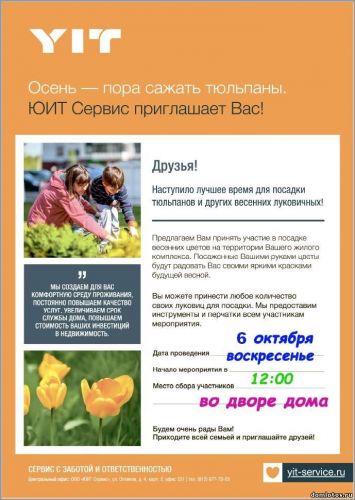 Уважаемые жители нашего дома! Приглашаем Вас принять участие в семейном мероприятии по высадке тюльпанов в нашем дворе. (кликните на изображение для его увеличения до читаемых размеров)