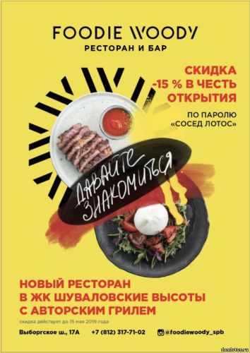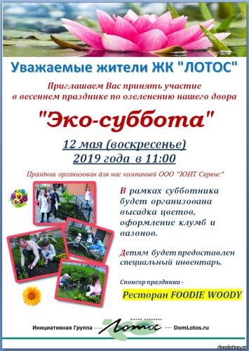 Уважаемые собственники и жители нашего дома! Управляющая компания ООО "ЮИТ Сервис" приглашает принять участие в ЭКО-субботе 12 мая 2019 года в 11:00 Украсим наш двор цветами! (картинка увеличивается при клике на ней) С этом году спонсором данного мероприятия выступает ресторан и бар FOODIE WOODY (Выборгское ш., 17А) (картинка увеличивается при клике на ней) ЭКО субботник проводится в нашем доме уже в седьмой раз. ... Читать дальше » |